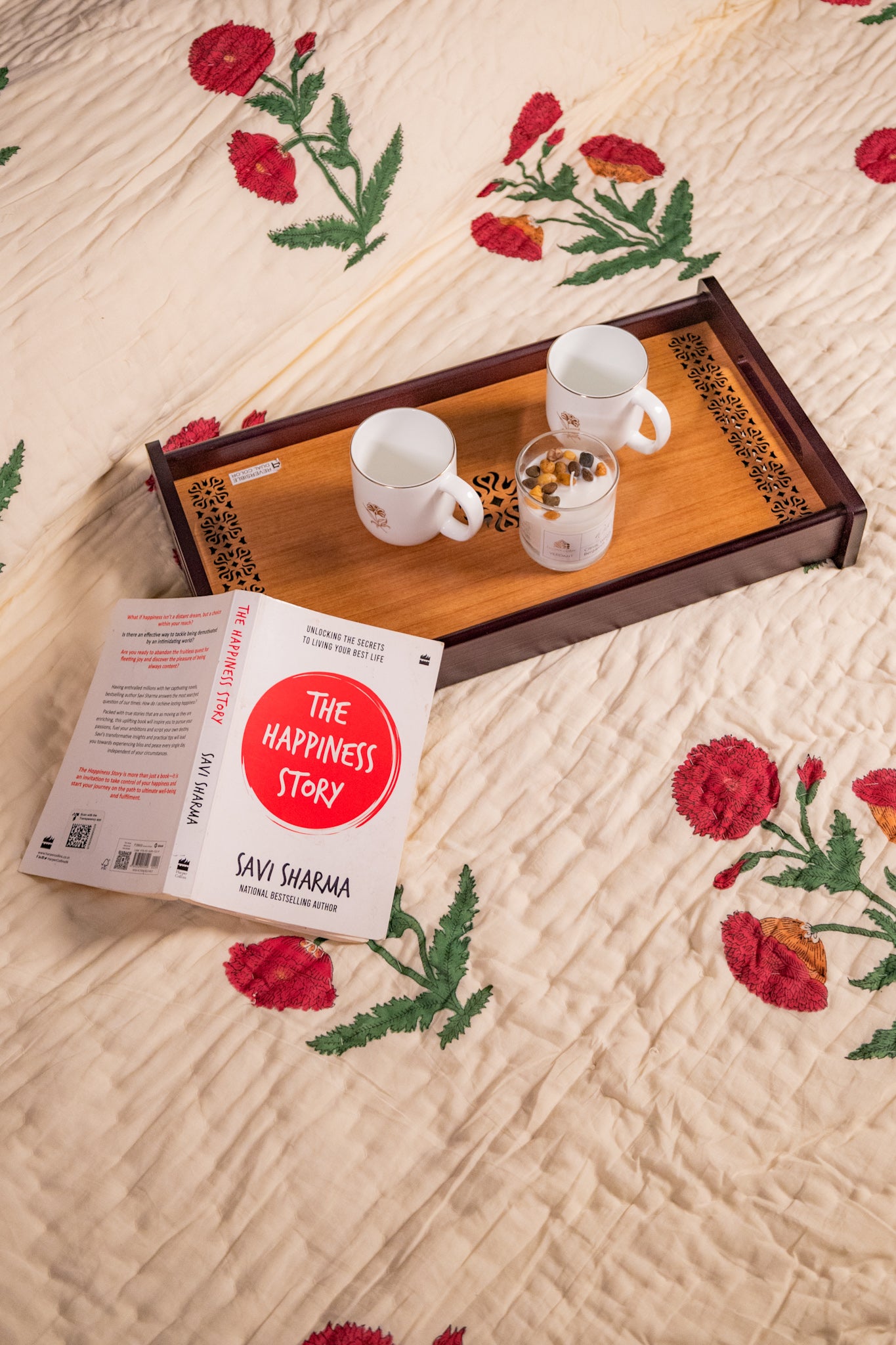 Bring a touch of timeless elegance to your bedroom with this handcrafted cotton quilt. The soft ivory base is adorned with vibrant red poppy motifs and lush green stems, created using traditional Indian block-printing techniques. A reversible backing in a playful red and white zig-zag adds versatility and charm, while the fine hand-quilted texture offers year-round comfort.