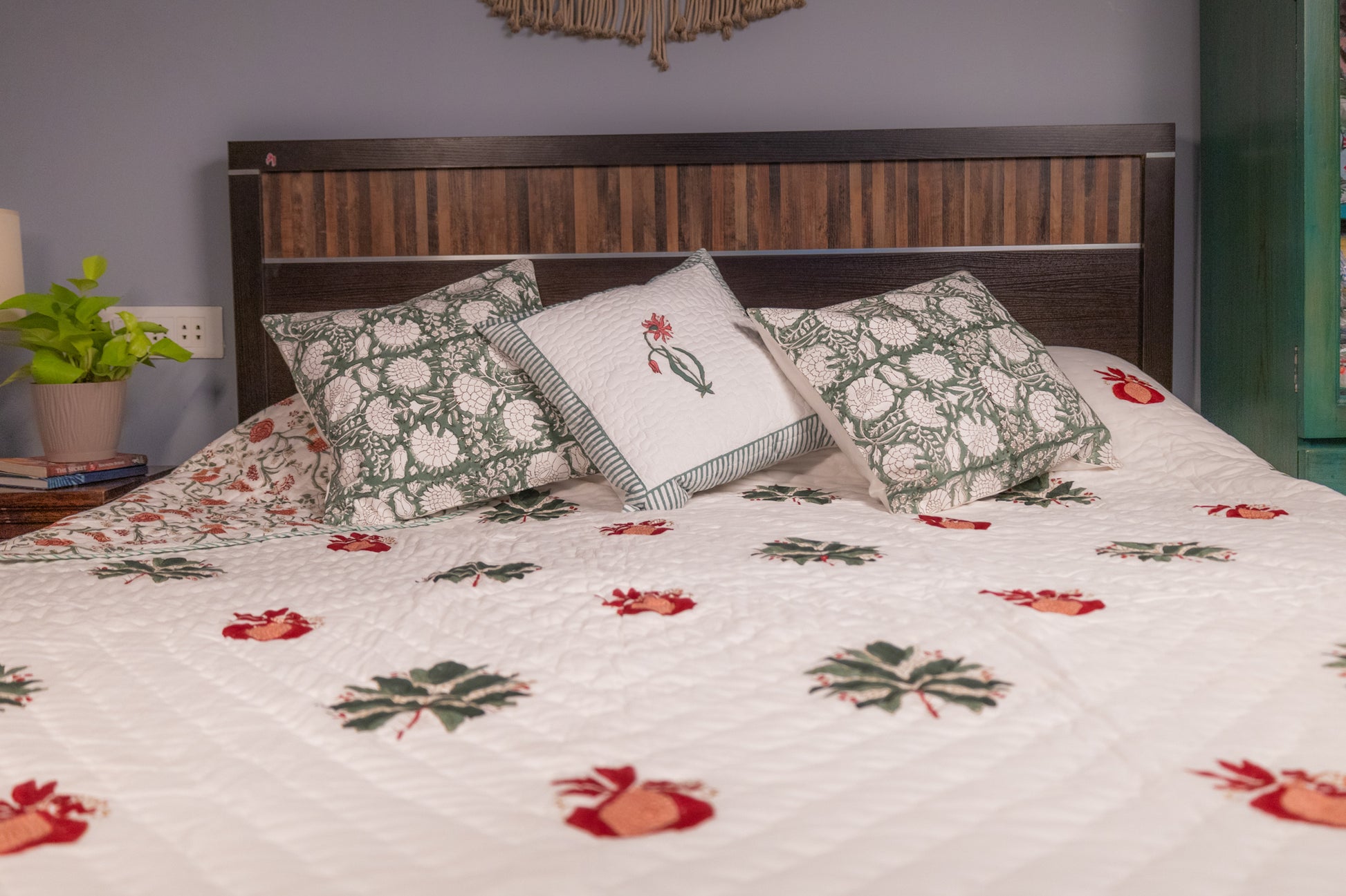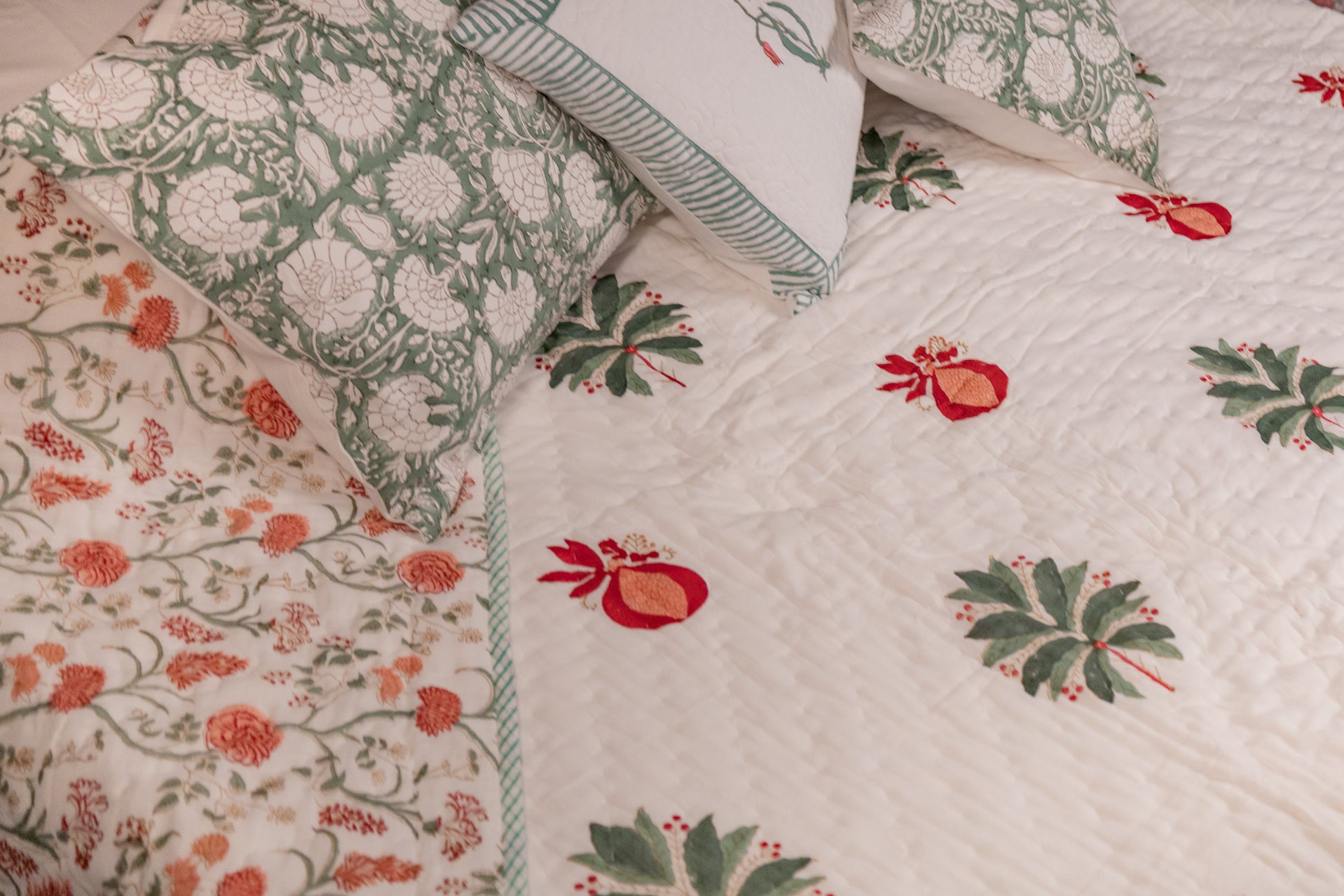 Add a burst of color to your bedroom with this vibrant pomegranate-inspired quilt. Crafted in soft 100% cotton, it features bold crimson pomegranates and lush green foliage on a creamy base, finished with delicate hand-quilting for a luxurious yet breathable feel. The reverse side offers a lively floral pattern, giving you two looks in one.