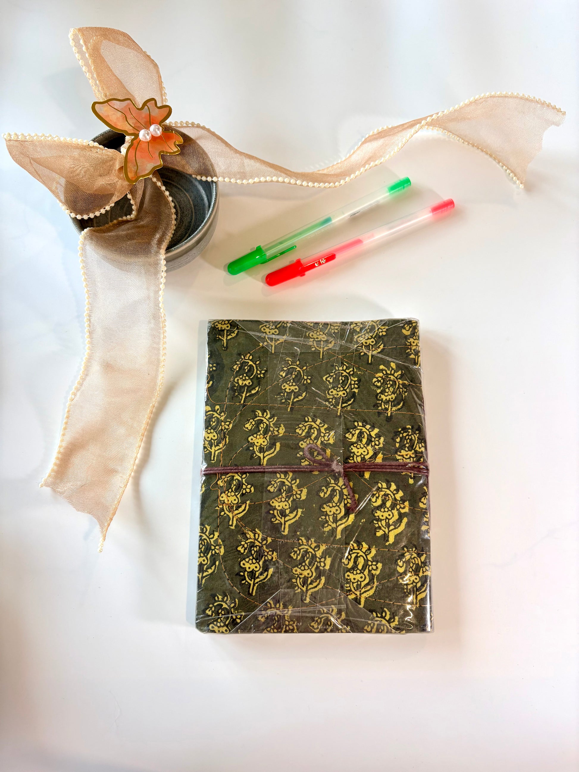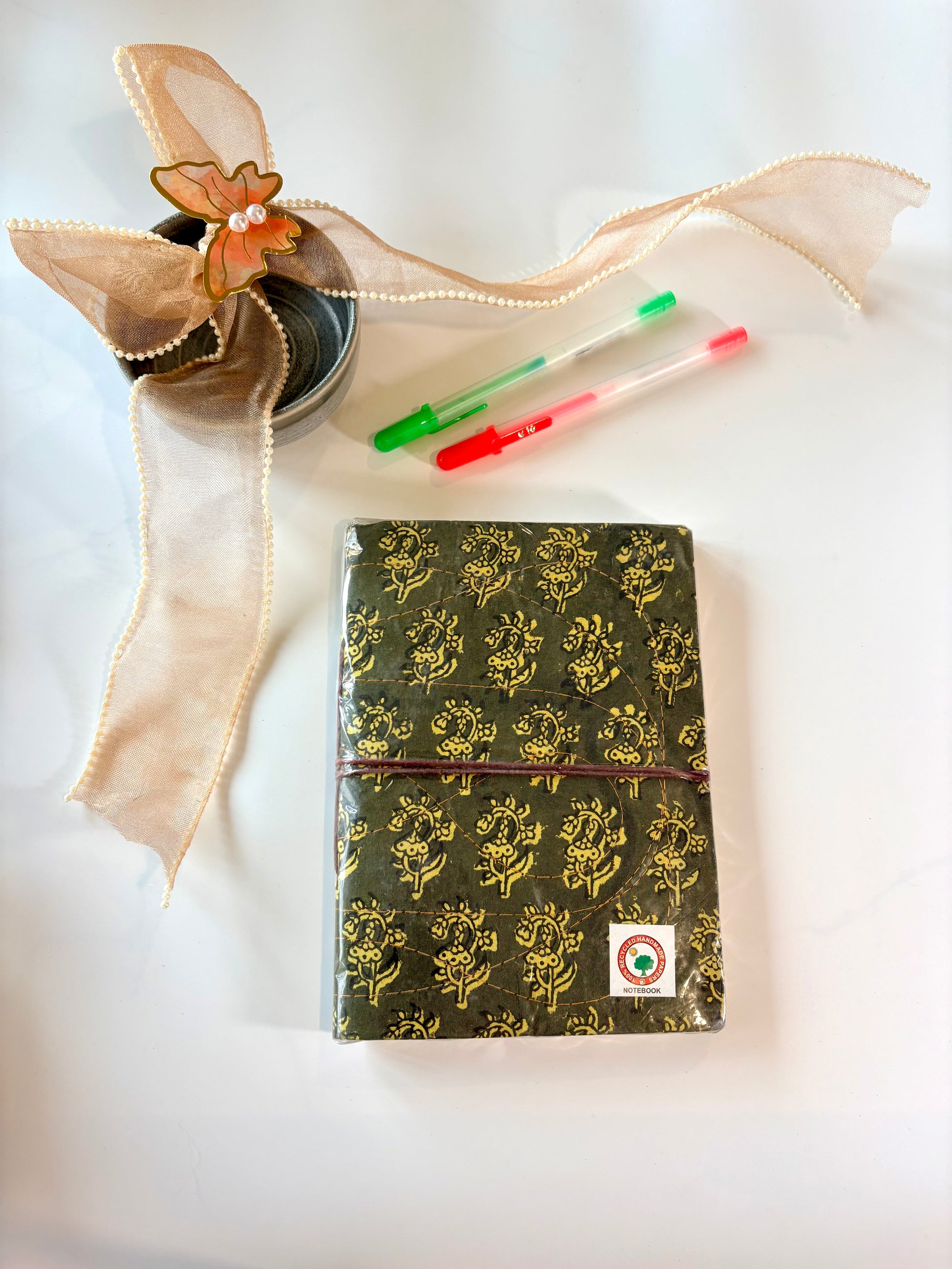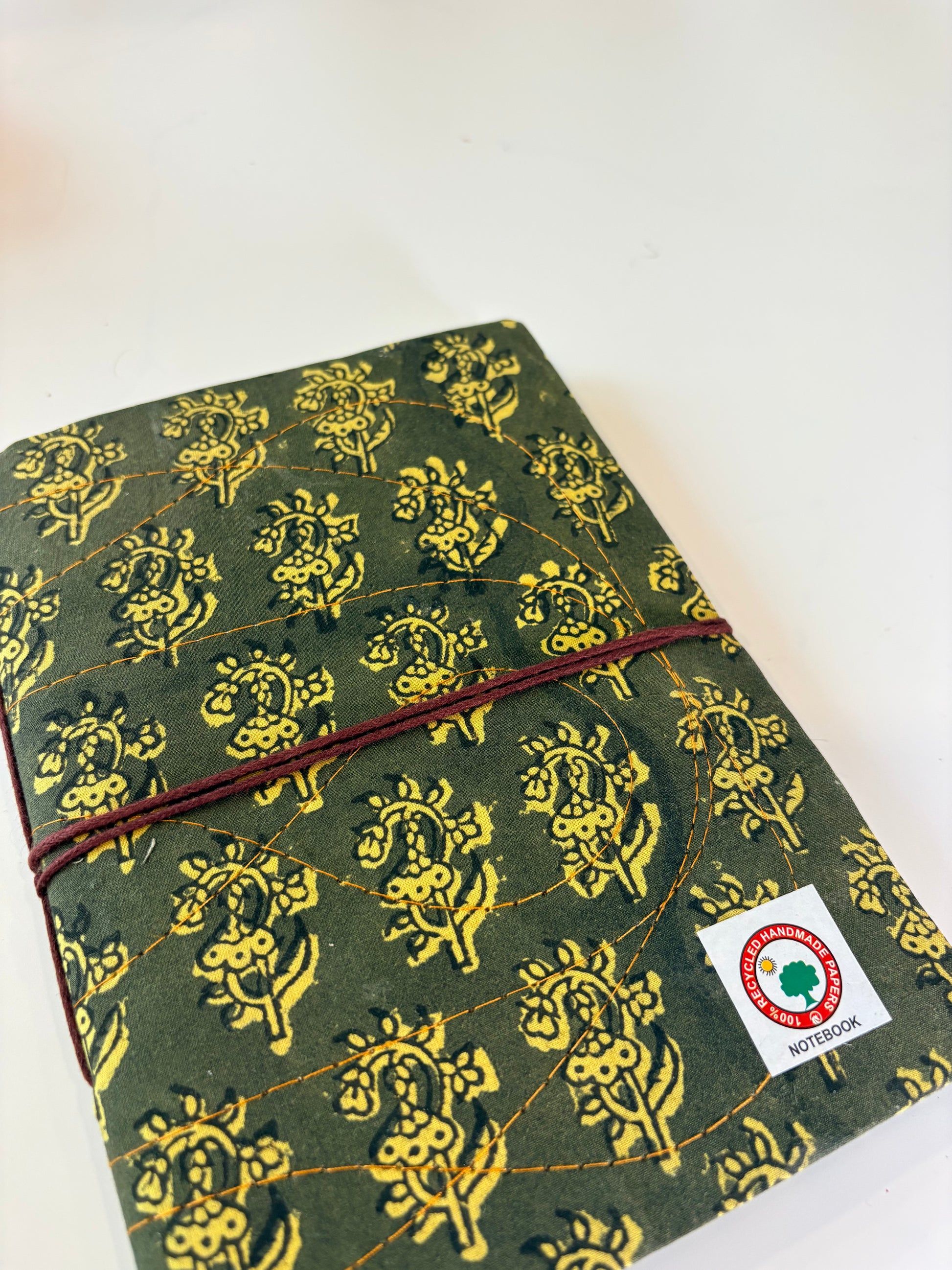Handmade with care using 100% recycled paper, each journal is wrapped in artisanal block-printed fabric.