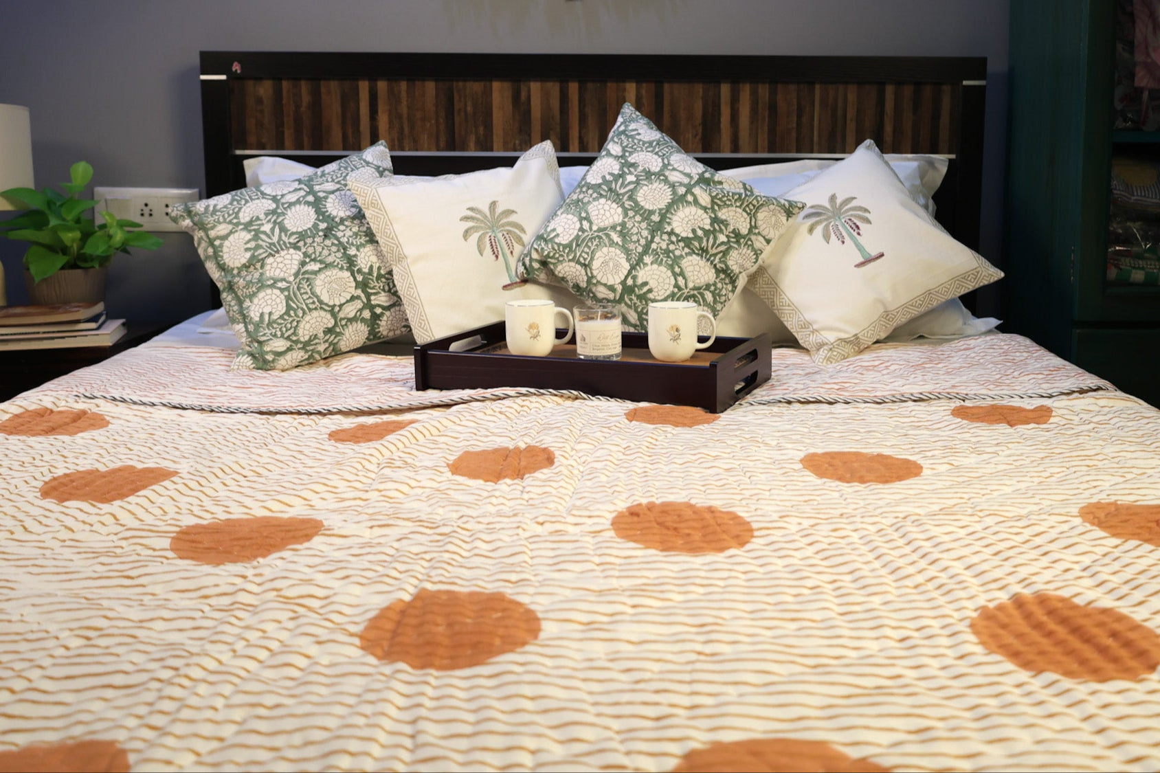 This 100% cotton quilt features a playful mix of earthy mustard polka dots and fine mustard and black stripes, accented with a bold chevron border. Each piece is hand block-printed by artisans, giving every quilt its own subtle variations and character.