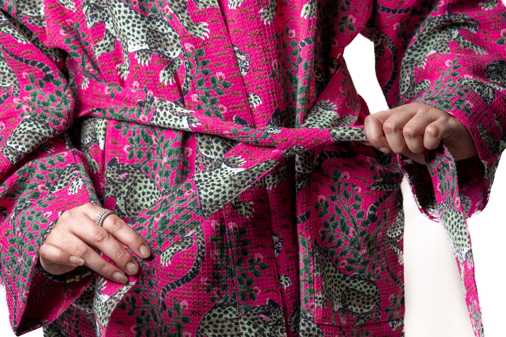 This bold pink stunner comes alive with a wild jungle print. Think fierce leopards and tropical vines on soft, textured waffle cotton. It doesn't bleed through.