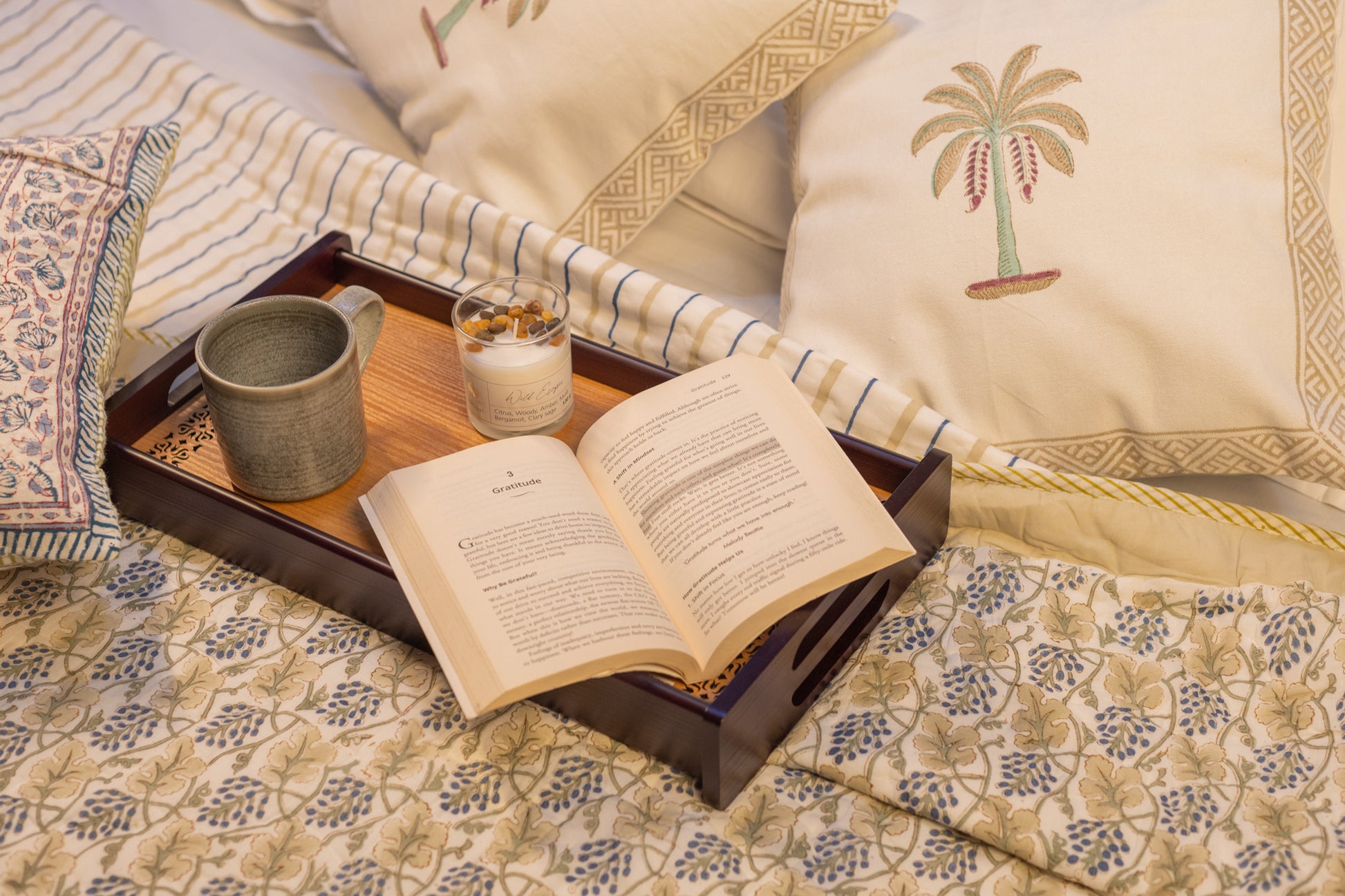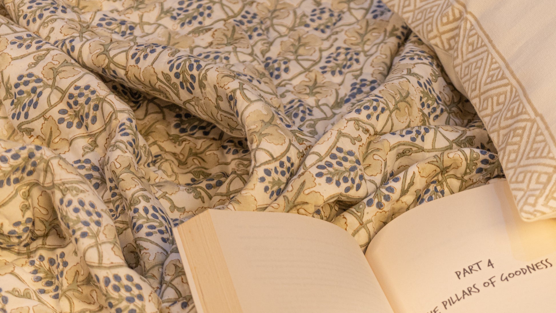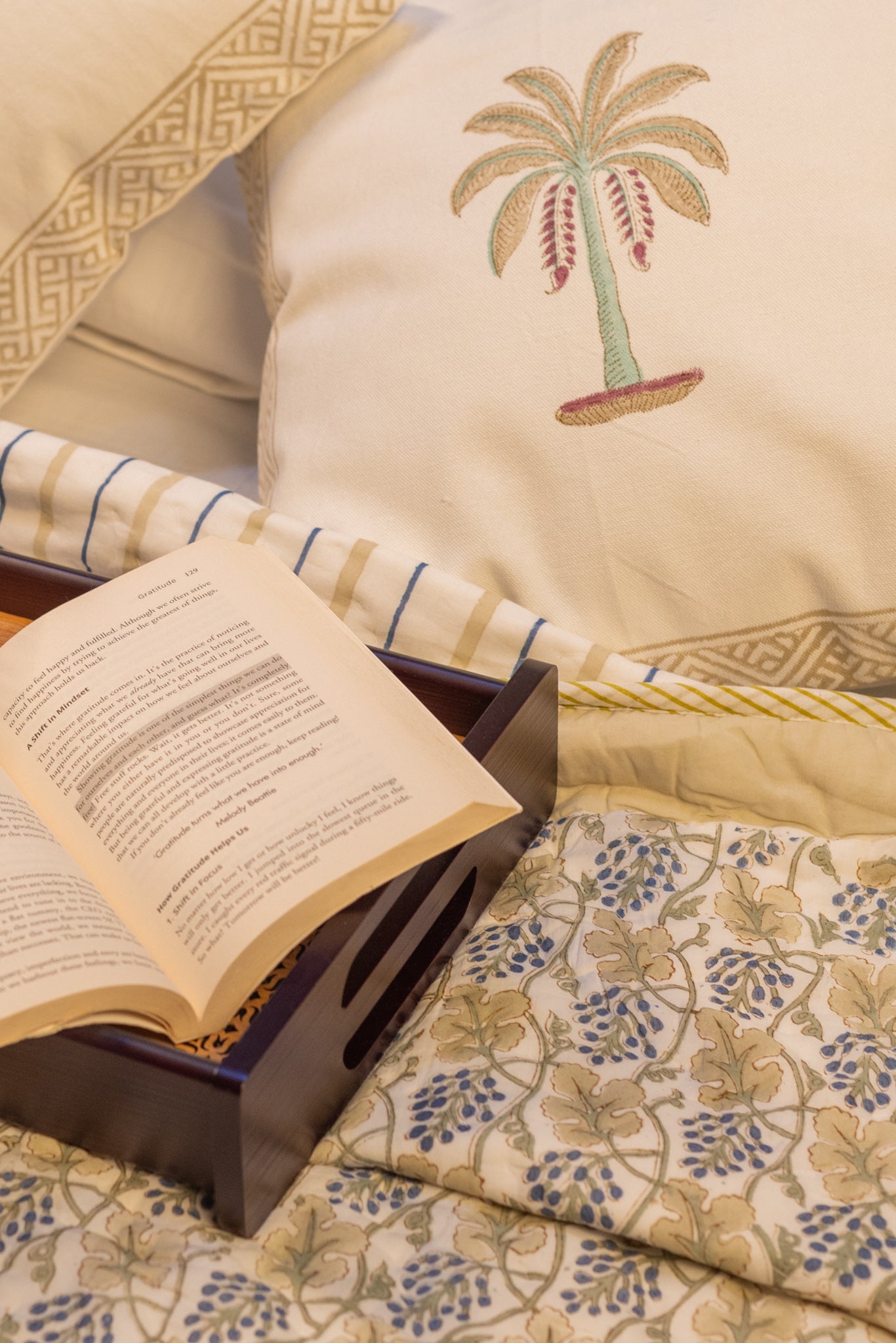 Soft beige with olive and indigo vines, this quilt brings a warm, earthy elegance to your space. Hand block-printed on pure cotton, it’s lightly quilted for comfort and features a reversible side with minimal blue-gold stripes.